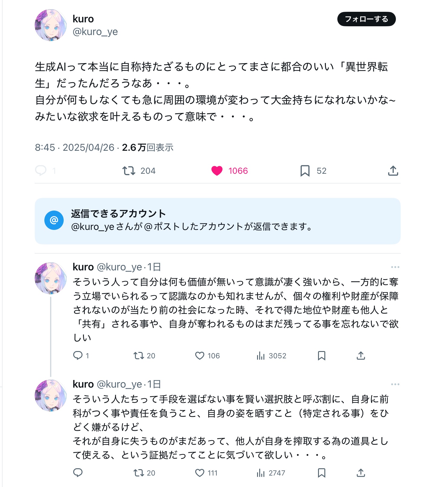 生成AIで自分を超えてくる勢力が嫌いなんだろうなってのは感じてたわ