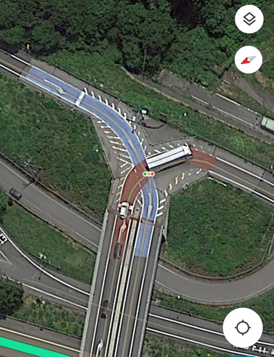 本線上り線への流入ランプと、本線上り線から料金所方面への流出ランプが平面交差