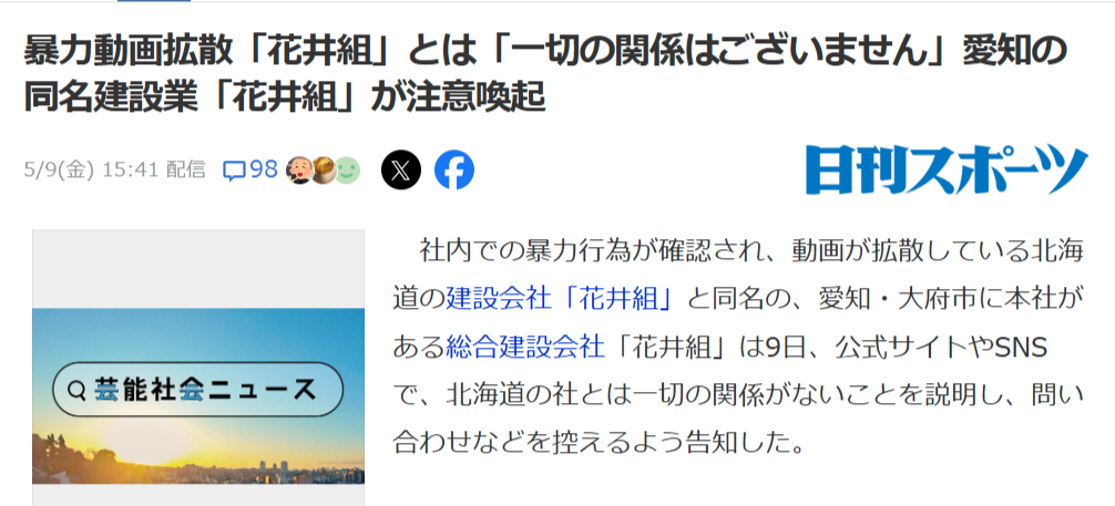 暴力動画拡散「花井組」とは「一切の関係はございません」愛知の同名建設業「花井組」が注意喚起(日刊スポーツ)