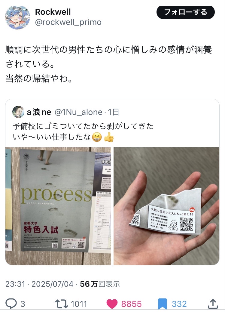本題みたいな元々京大に入る学力も無い奴が「僕チンが京大に入れないのは女枠のせい!」って考えて自分のプライド守るにはうってつけやん