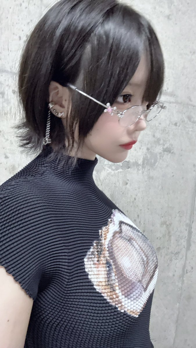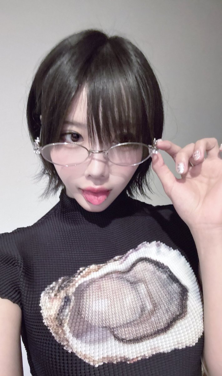 Xでは黒髪ショートで、眼鏡姿の写真を公開。黒いシャツの柄は独特で胸に大きく牡蠣が描かれている。