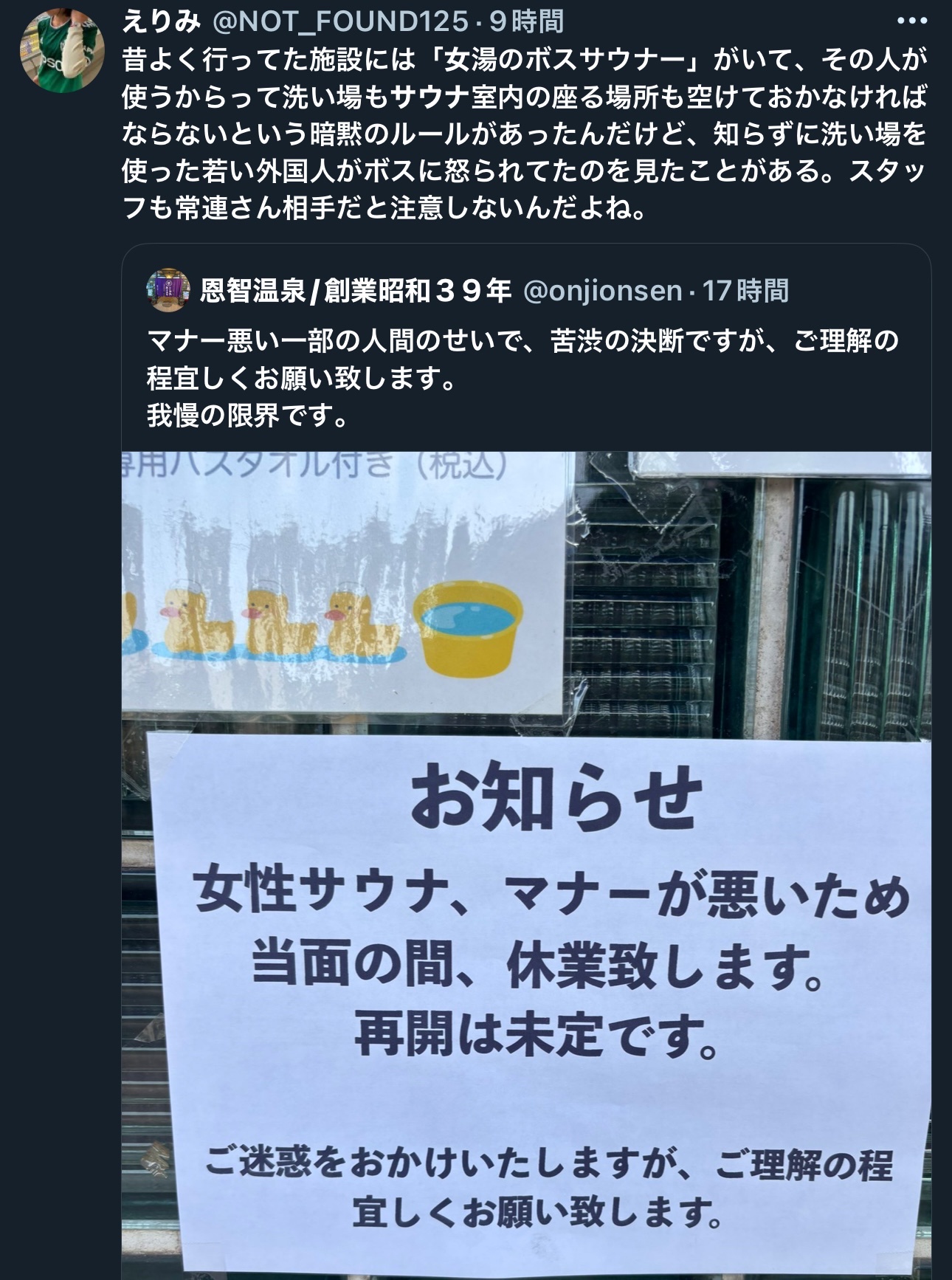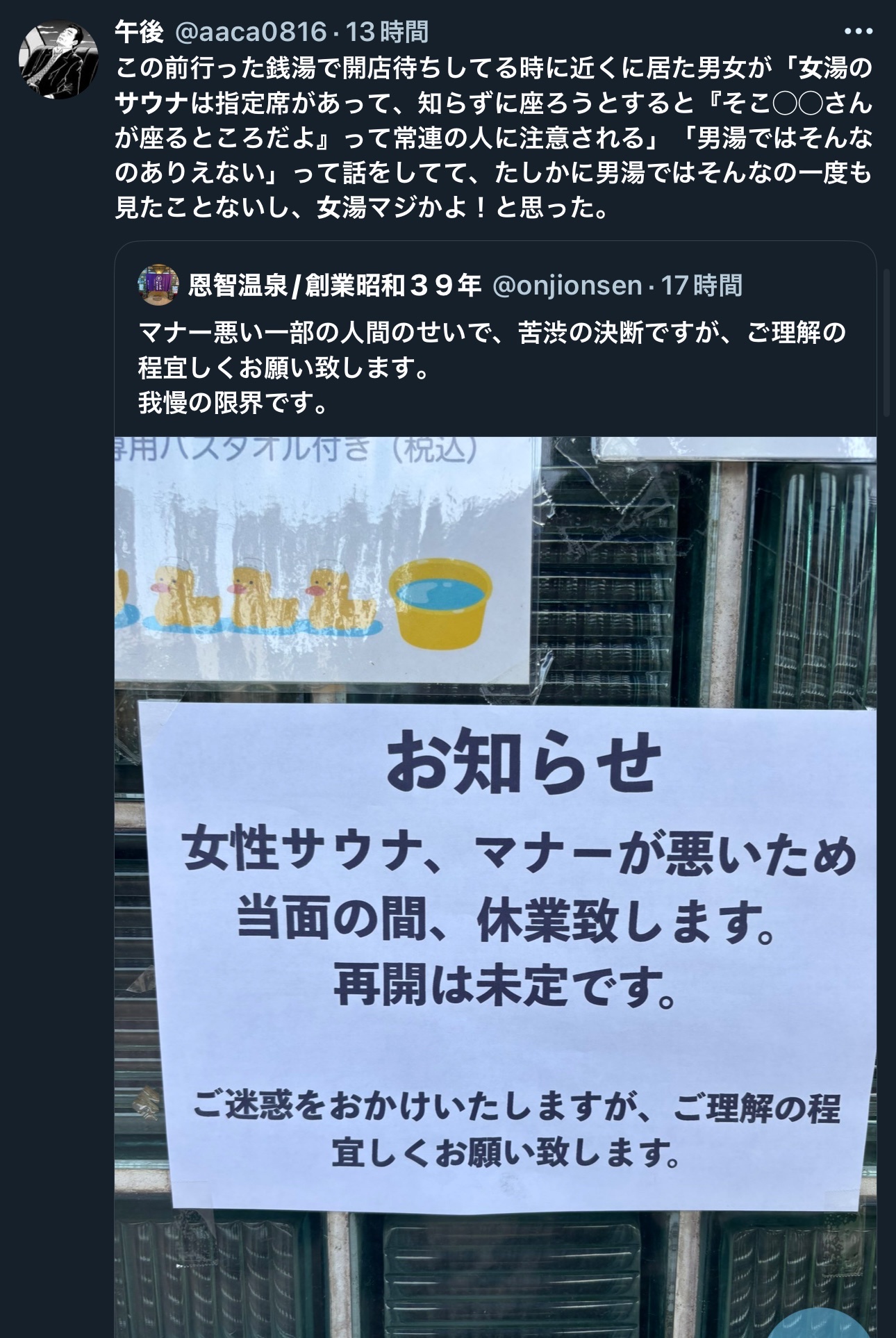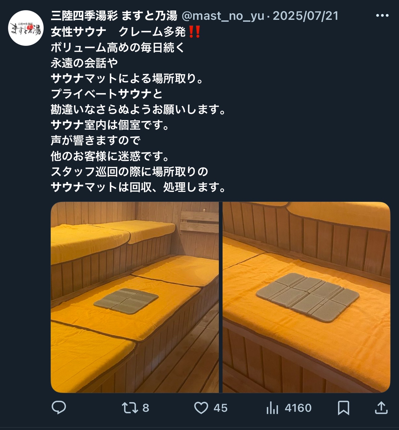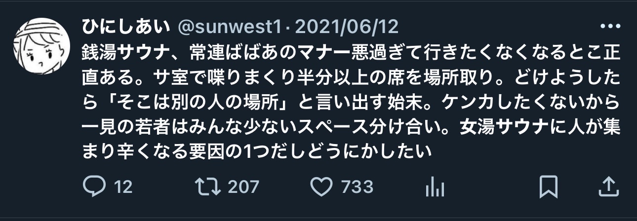 数で見たら男湯サウナの方が圧倒的に迷惑行為多いわ