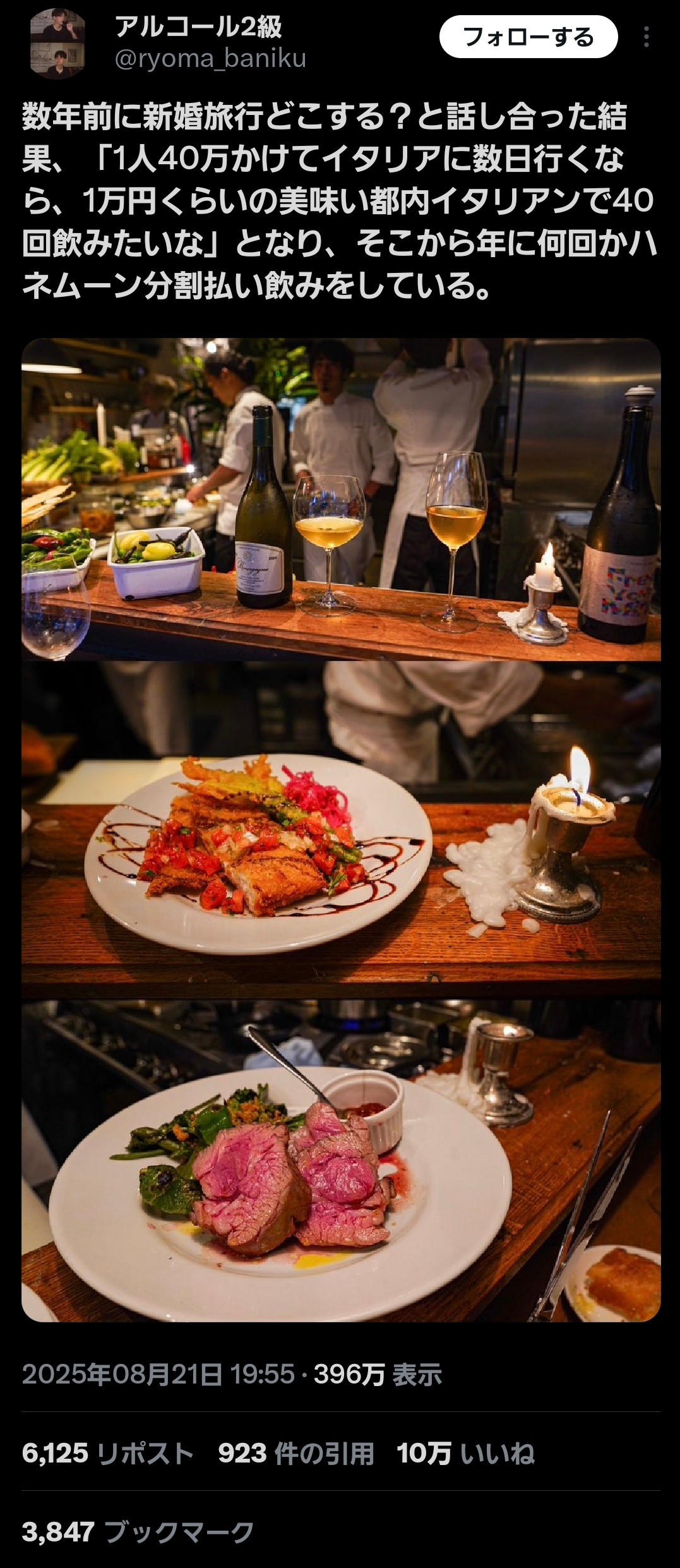 数年前に新婚旅行どこする?と話し合った結果、「1人40万かけてイタリアに数日行くなら、1万円くらいの美味い都内イタリアンで40回飲みたいな」となり、そこから年に何回かハネムーン分割払い飲みをしている。 pic.twitter.com/umQ97ZZ3SG