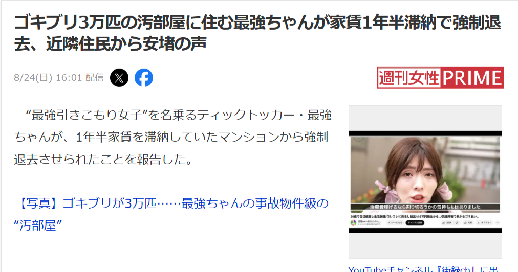 “最強引きこもり女子”を名乗るティックトッカー・最強ちゃんが、1年半家賃を滞納していたマンションから強制退去させられたことを報告した。