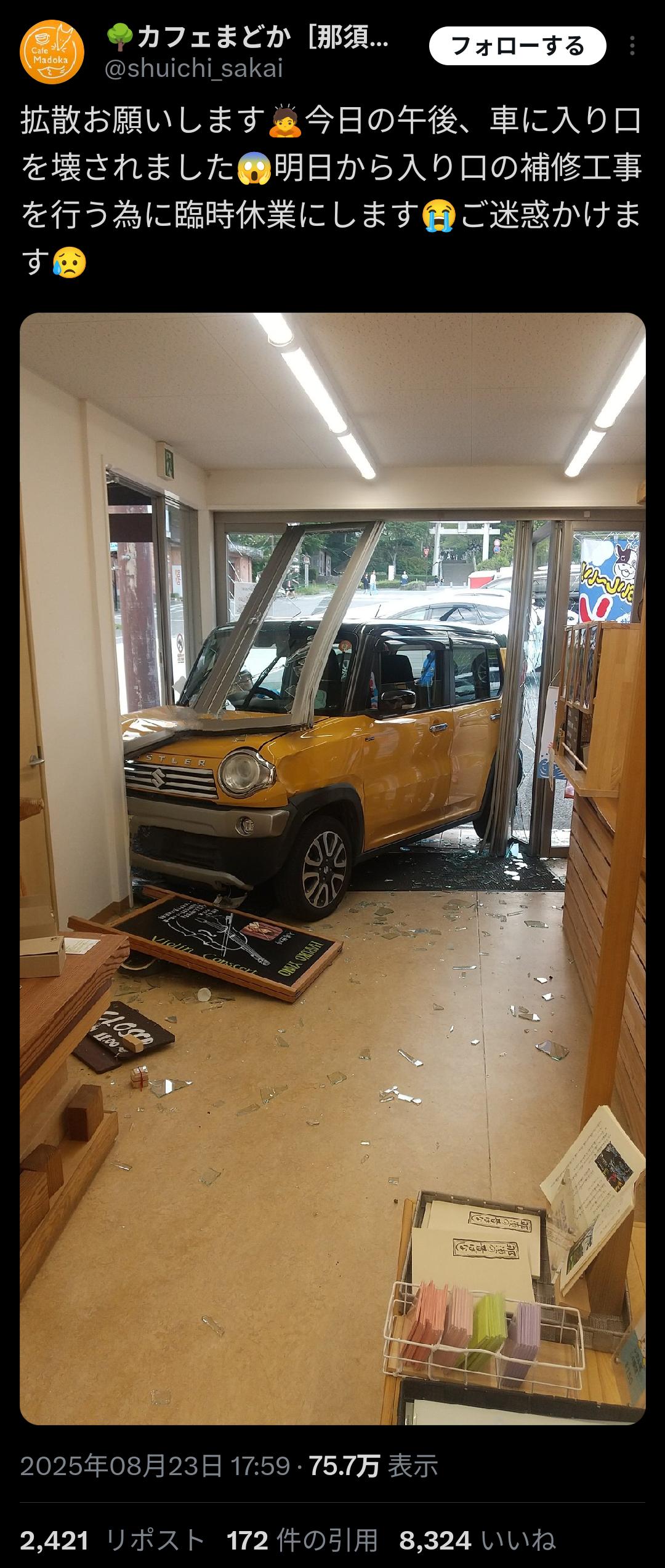 こんだけ派手に突っ込んどいてドライバーが逃げたってことはないでしょ。警察呼んで賠償の話つけたらそれで終わりじゃない?