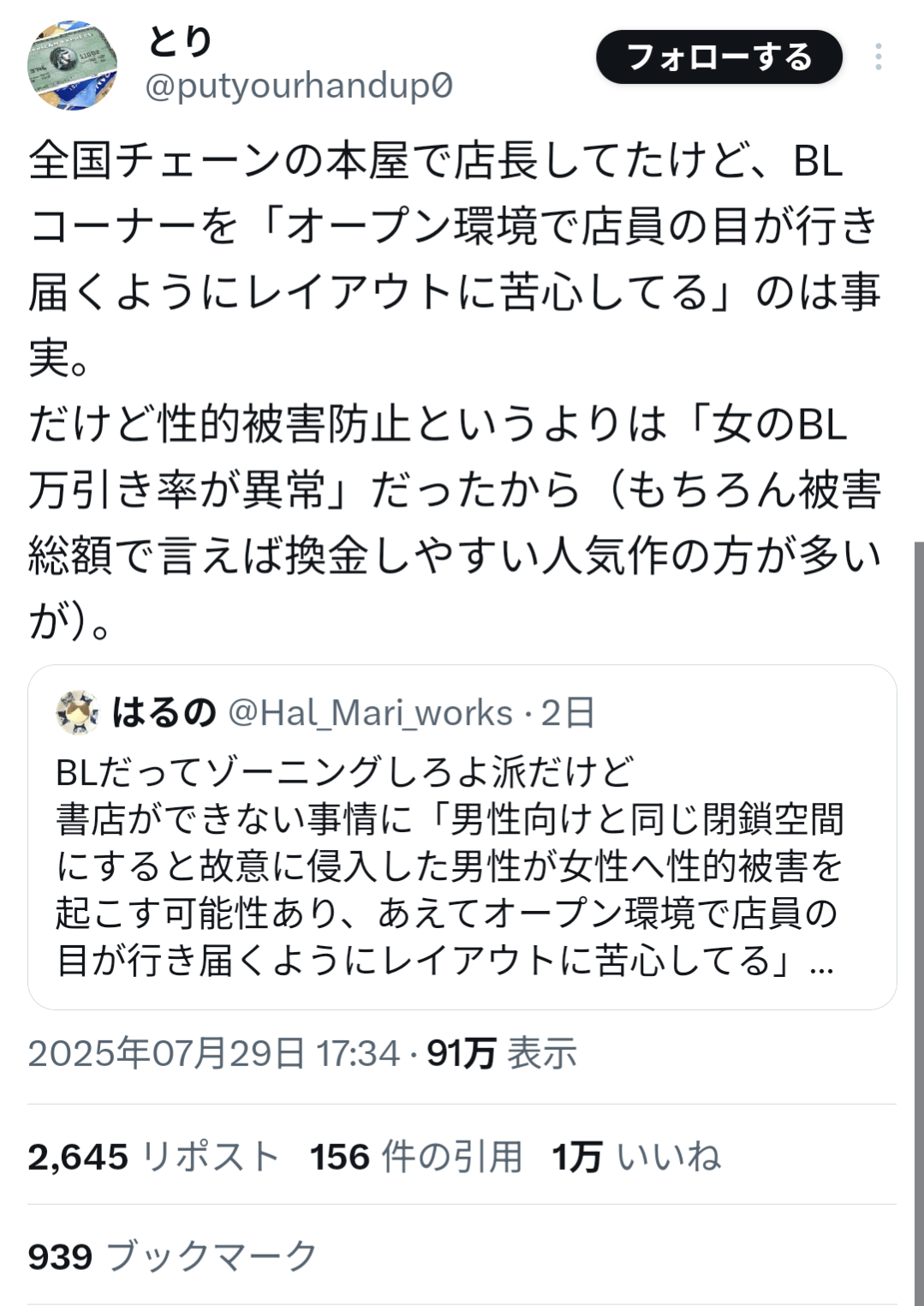 俺はゾーニング不要論者だからBLも男性向けも普通に陳列して売ればいいと思ってる