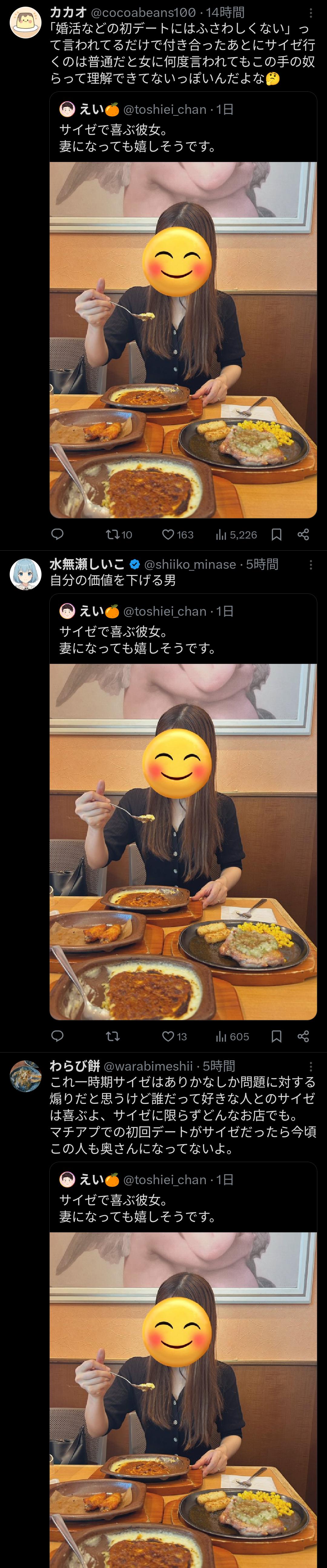 「付き合ってからだろうがサイゼリヤみたいな安い店に連れてかれて喜ぶ安い女にはなりたくない」みたいな女が一定数いるからこういうの投稿されるんだろ