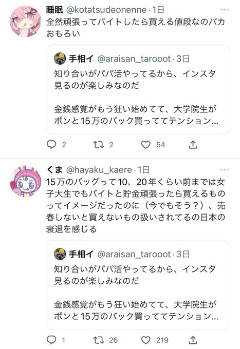 『大学院生がパパ活で金銭感覚が狂い15万円のバッグを買った』というツイートの引用リツイート欄に沸く"とある方々"に対し、答え合わせになっていると話題に... pic.twitter.com/ellX4kDVvw