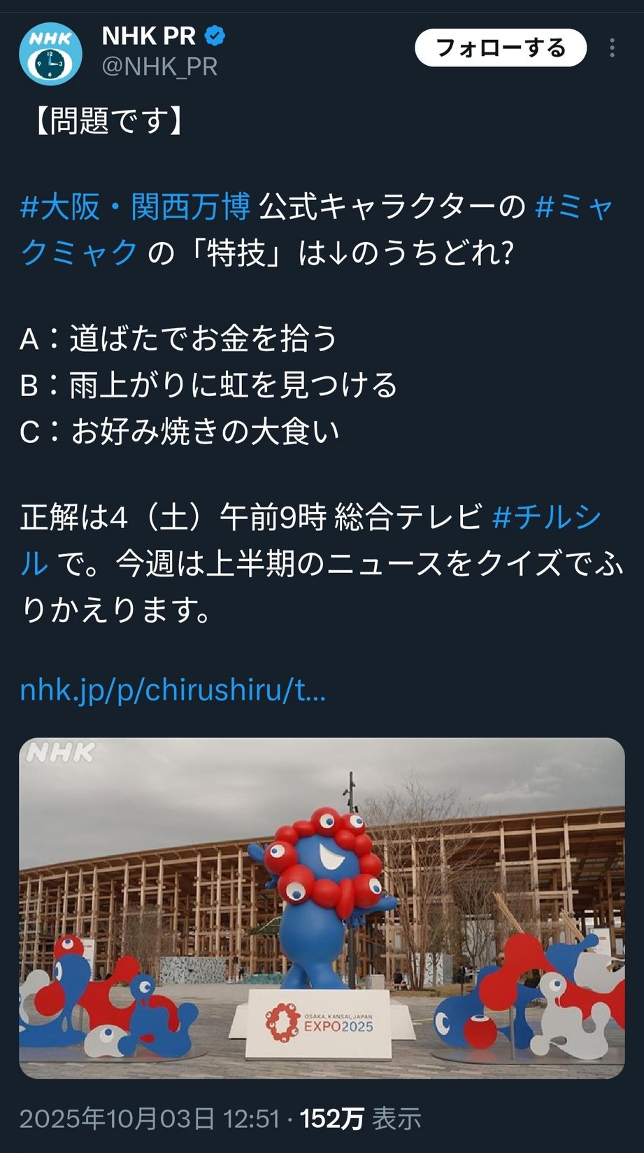 同アカウントは3日に大阪・関西万博の公式キャラクター「ミャクミャク」の特技に関するクイズを投稿。その選択肢に「道ばたでお金を拾う」「お好み焼きの大食い」などがあり、物議を醸していた。
