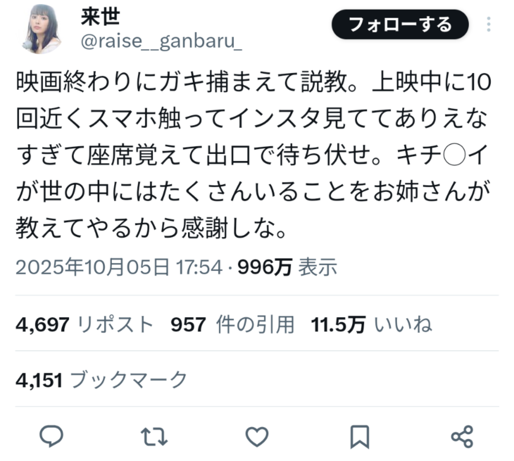 ワイもこの前国宝見てる時にべちゃくちゃうるさいジジババに「黙れヨォ!!!!」って叫んだで