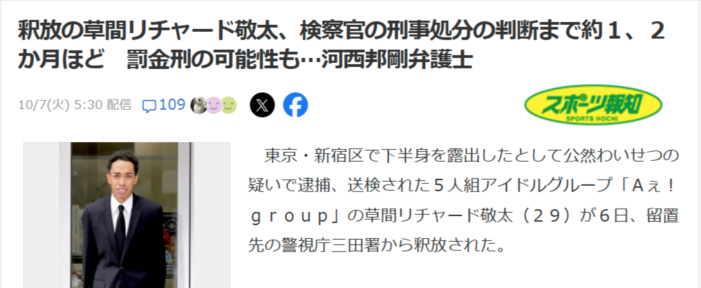 釈放の草間リチャード敬太、検察官の刑事処分の判断まで約1、2か月ほど 罰金刑の可能性も…河西邦剛弁護士