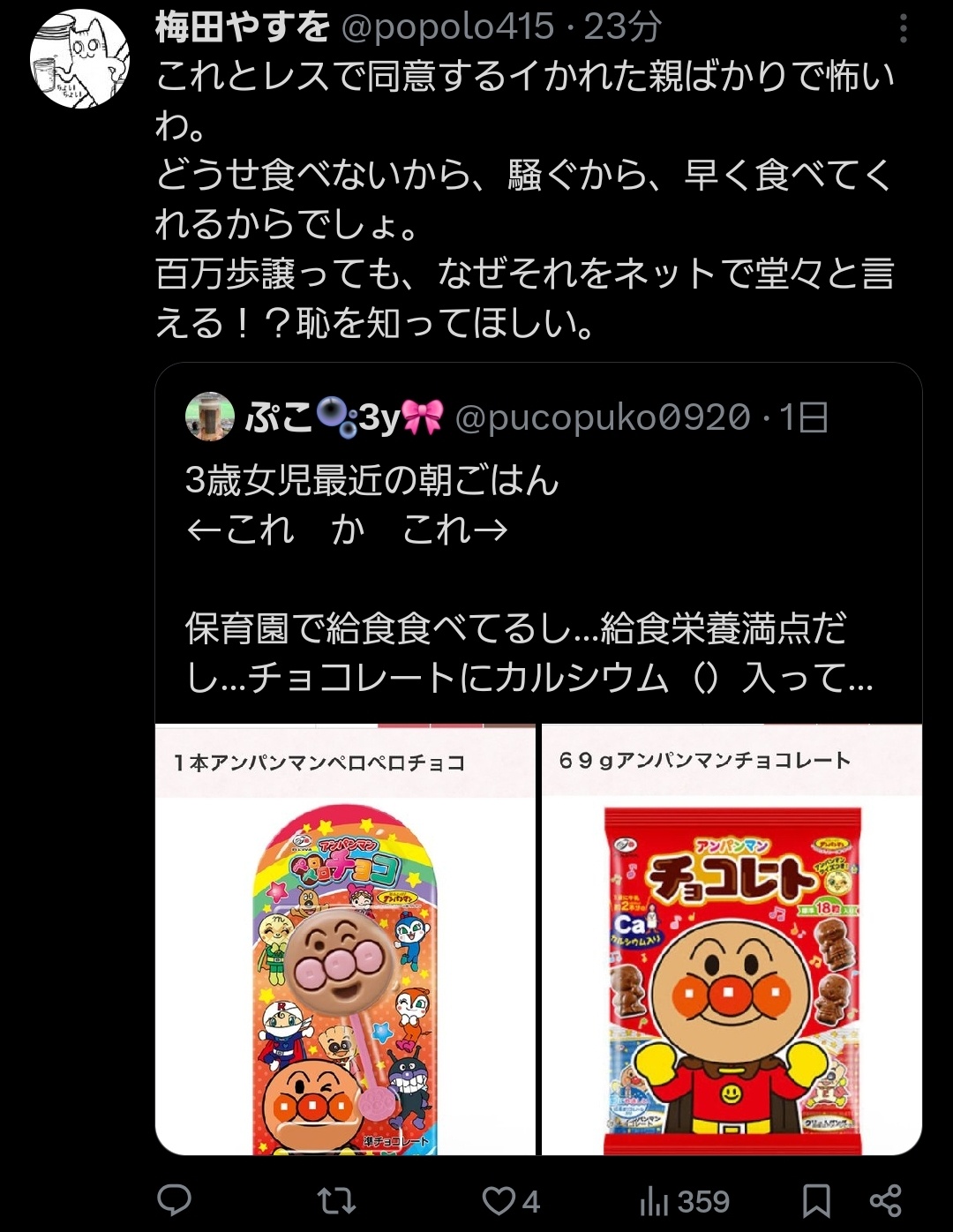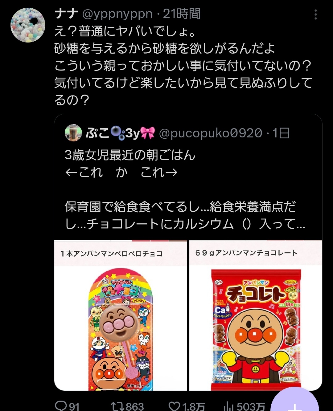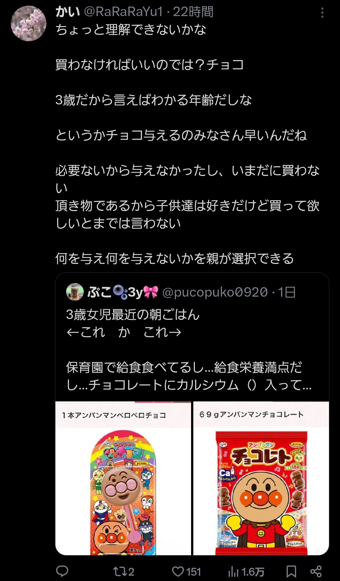 これにごちゃごちゃ言ってる人は多分子育てしたことないか、偏食なくめっちゃ食べる手のかからない子を育てたんだろうな、楽だったろうな、としか思わん。