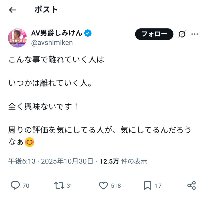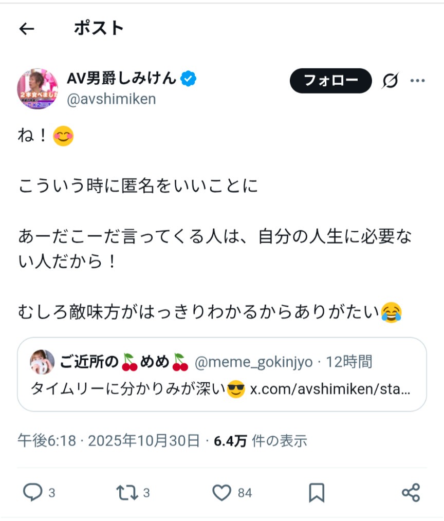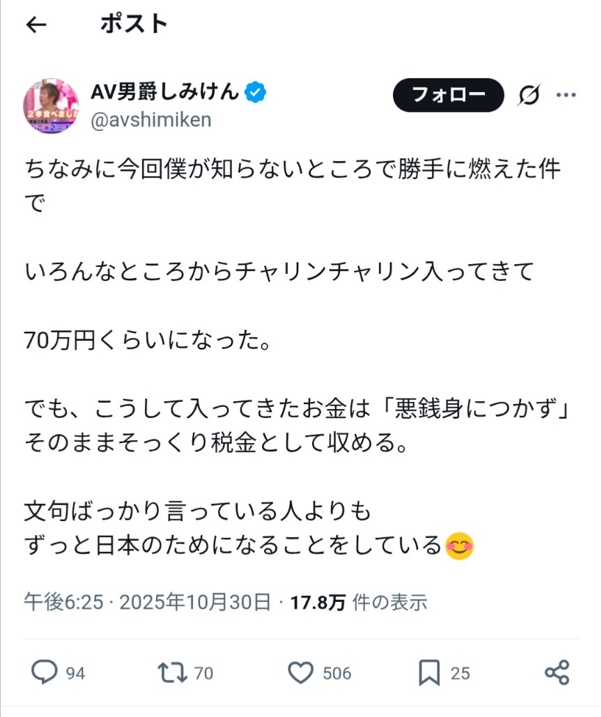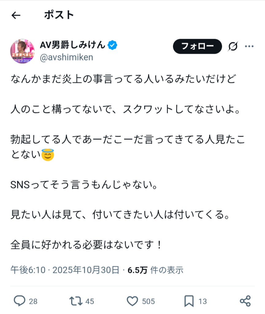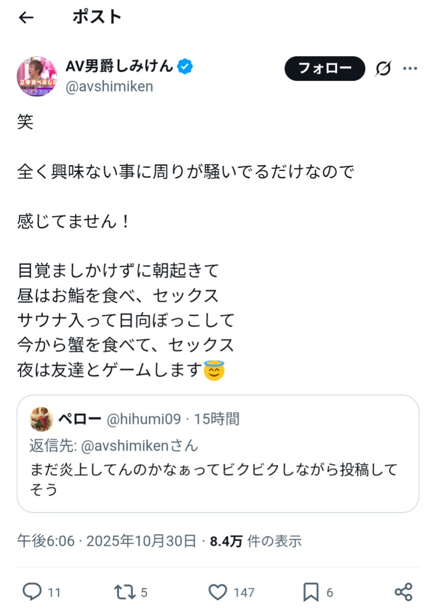 — AV男爵しみけん (@avshimiken) October 30, 2025