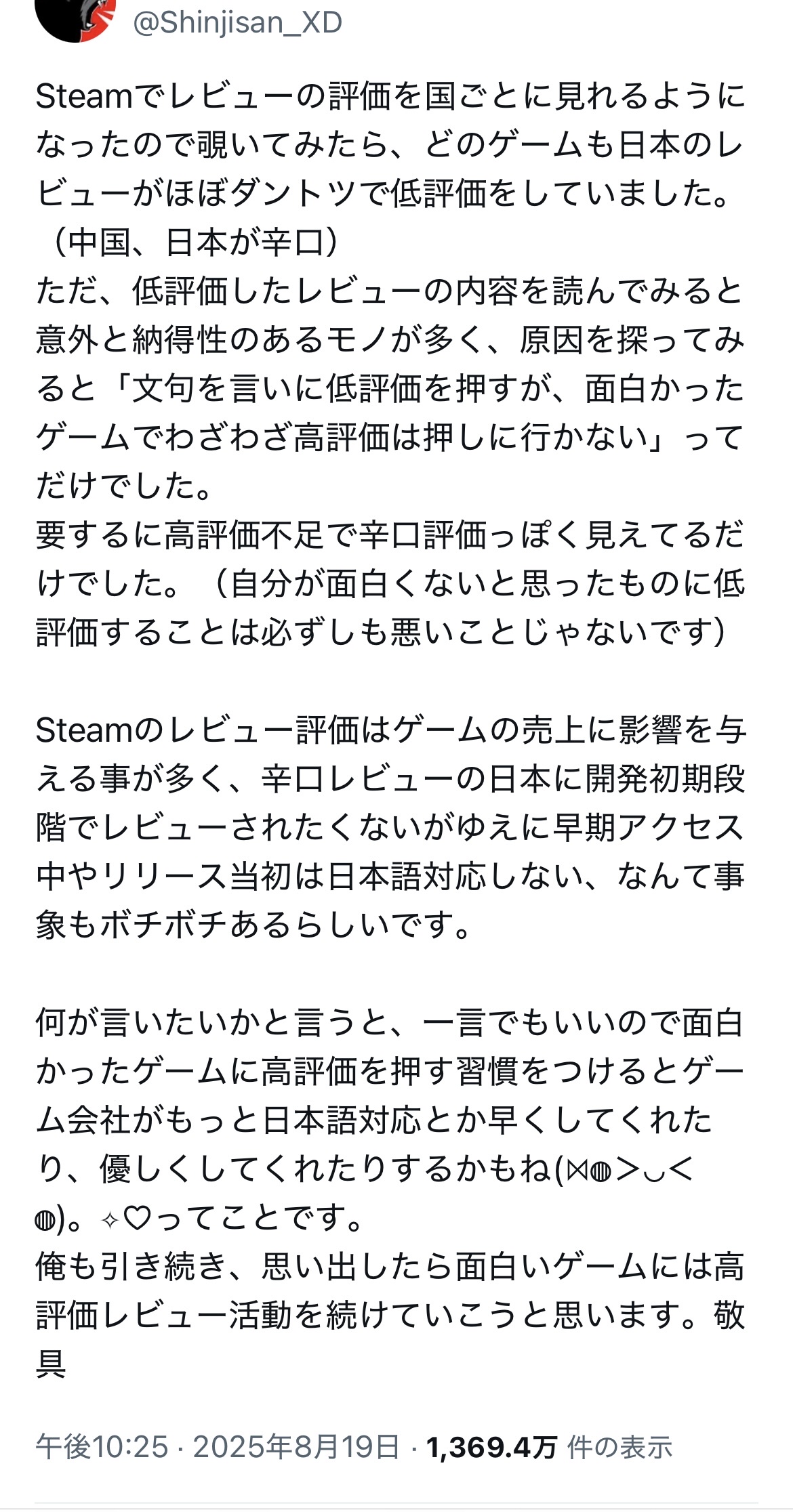 Steamでレビューの評価を国ごとに見れるようになったので覗いてみたら、どのゲームも日本のレビューがほぼダントツで低評価をしていました。(中国、日本が辛口)…