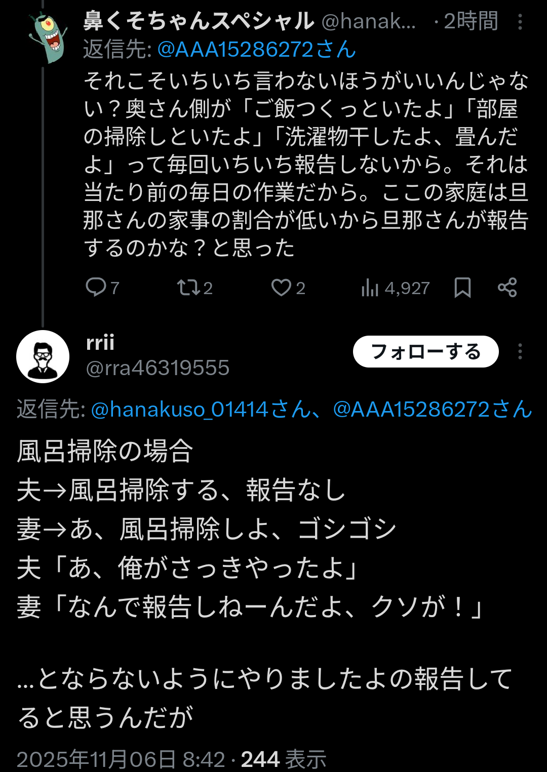 夫→風呂掃除する、報告なし