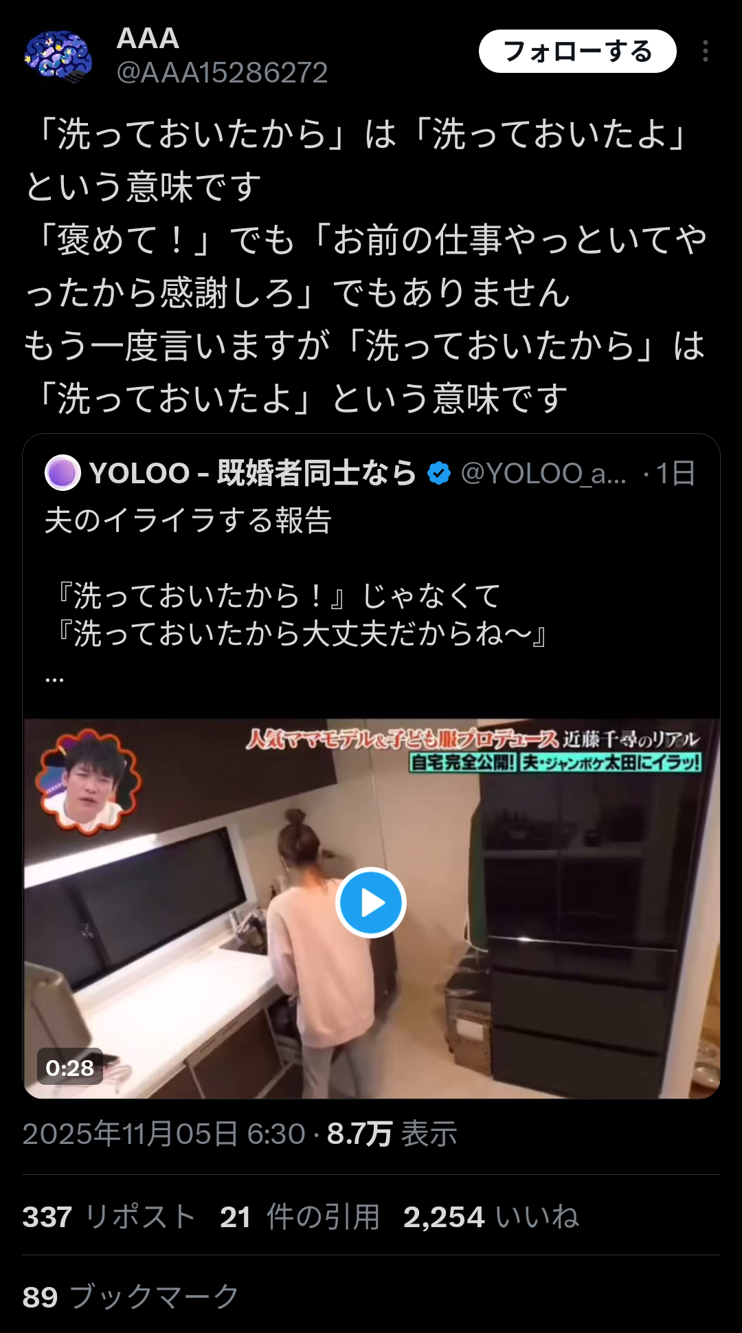 もう一度言いますが「洗っておいたから」は「洗っておいたよ」という意味です https://t.co/jV0IuTwZAv