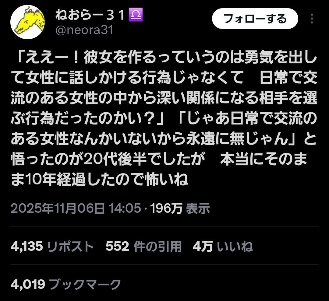 「ええー!彼女を作るっていうのは勇気を出して女性に話しかける行為じゃなくて 日常で交流のある女性の中から深い関係になる相手を選ぶ行為だったのかい?」「じゃあ日常で交流のある女性なんかいないから永遠に無じゃん」と悟ったのが20代後半でしたが 本当にそのまま10年経過したので怖いね