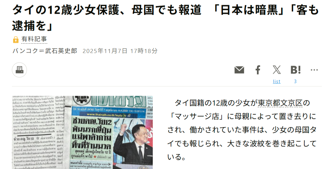 主要紙タイラットは7日、1面記事で「12歳少女、日本の地獄から保護」「母親がマッサージ店に置き去りにした」と報道。朝日新聞などの報道を引用して詳しく伝えた。別の主要紙マティチョンは6日、ウェブ版で「悲劇 12歳のタイ少女が、母親によって東京のマッサージ店に売られた」などと報じている。