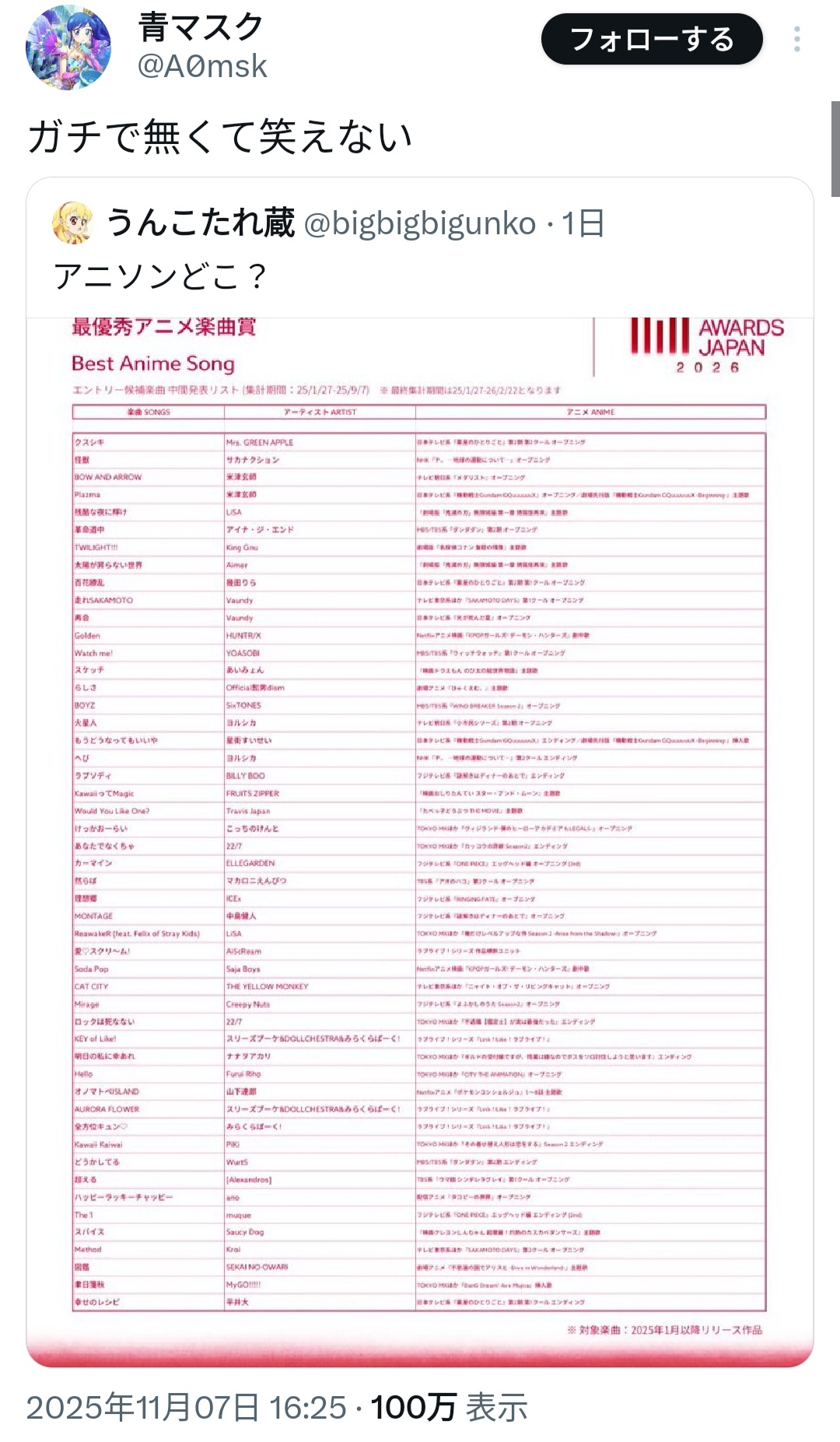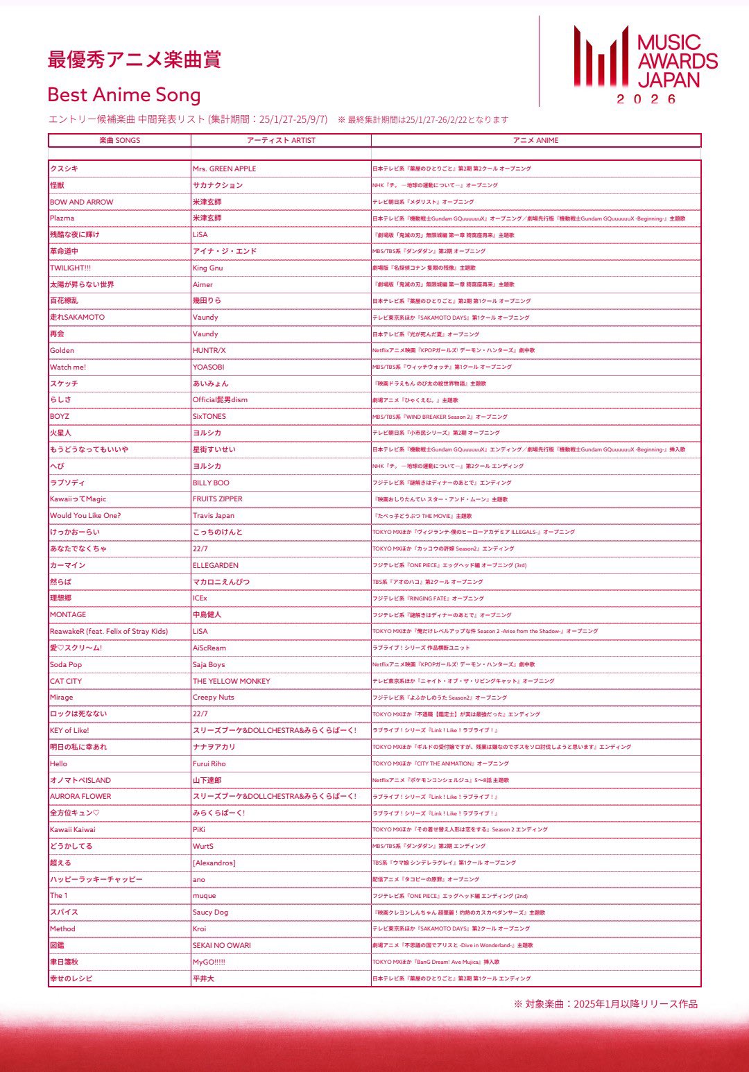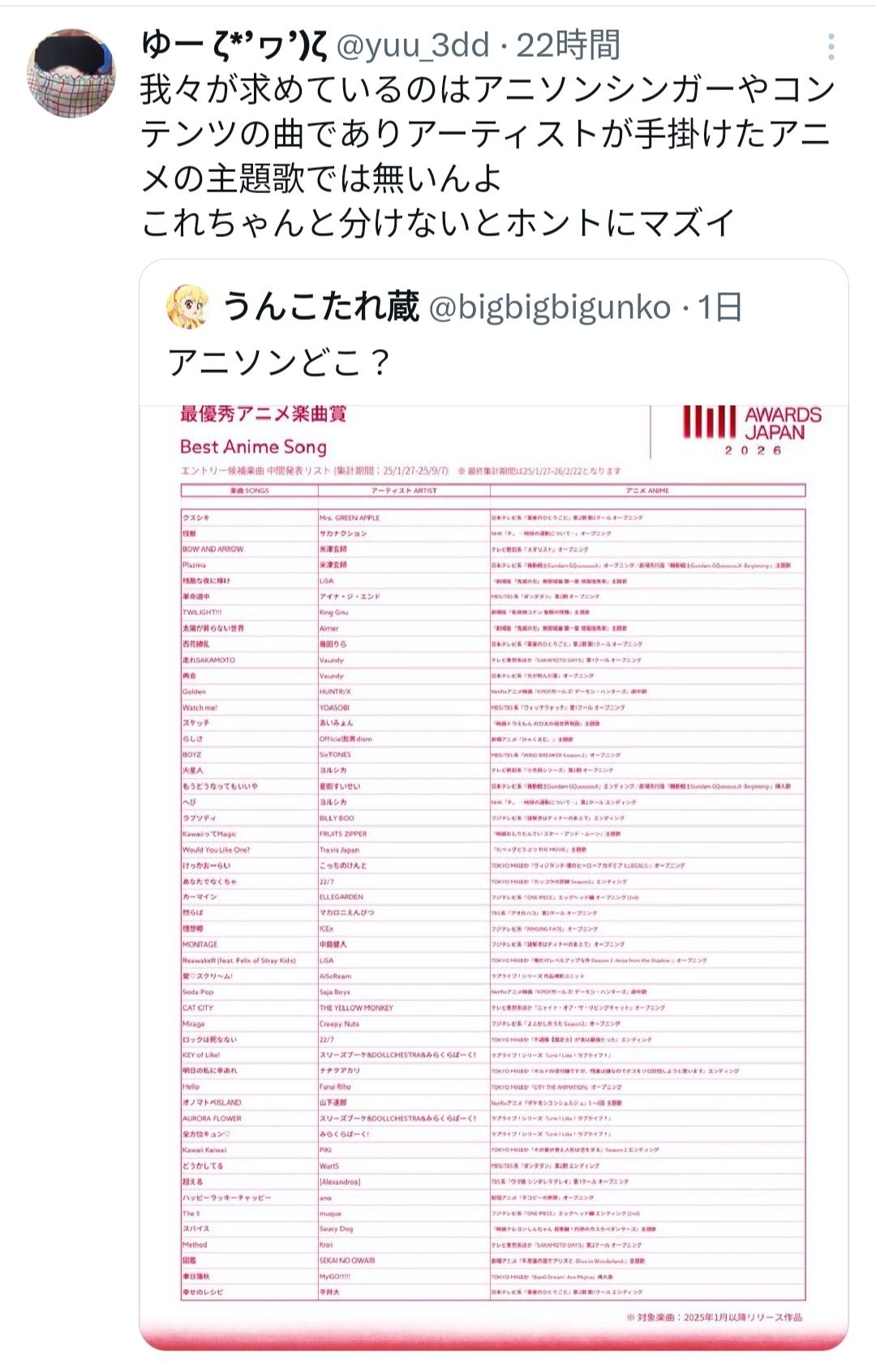 いうて2025年1月以降のリリース限定だとアニソンらしいアニソンってなによ