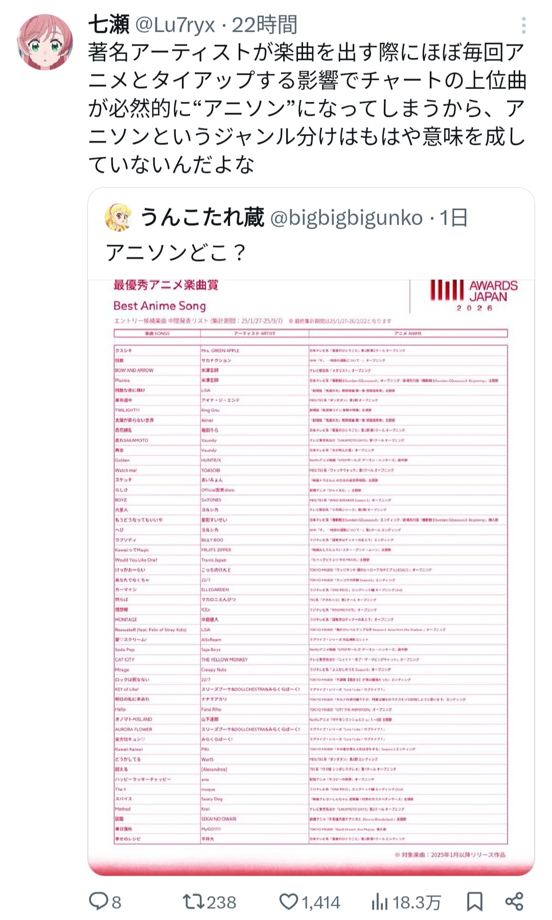 まぁ米津とナナヲアカリはアニソンでもええやろ
