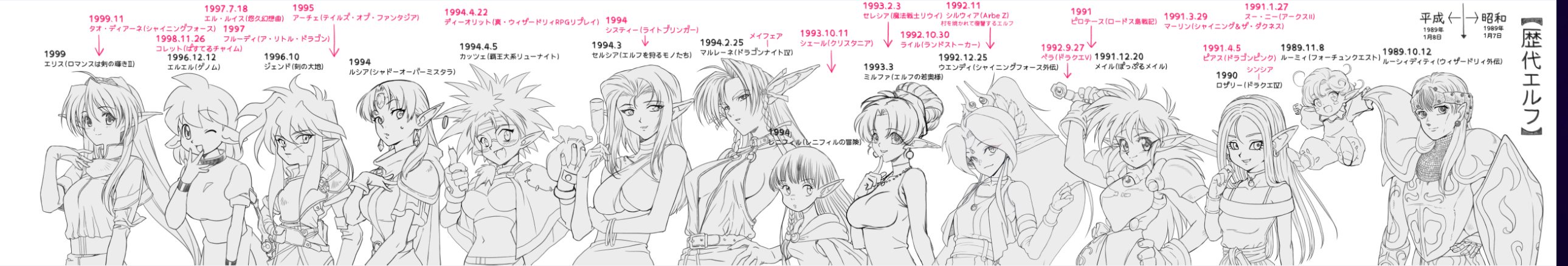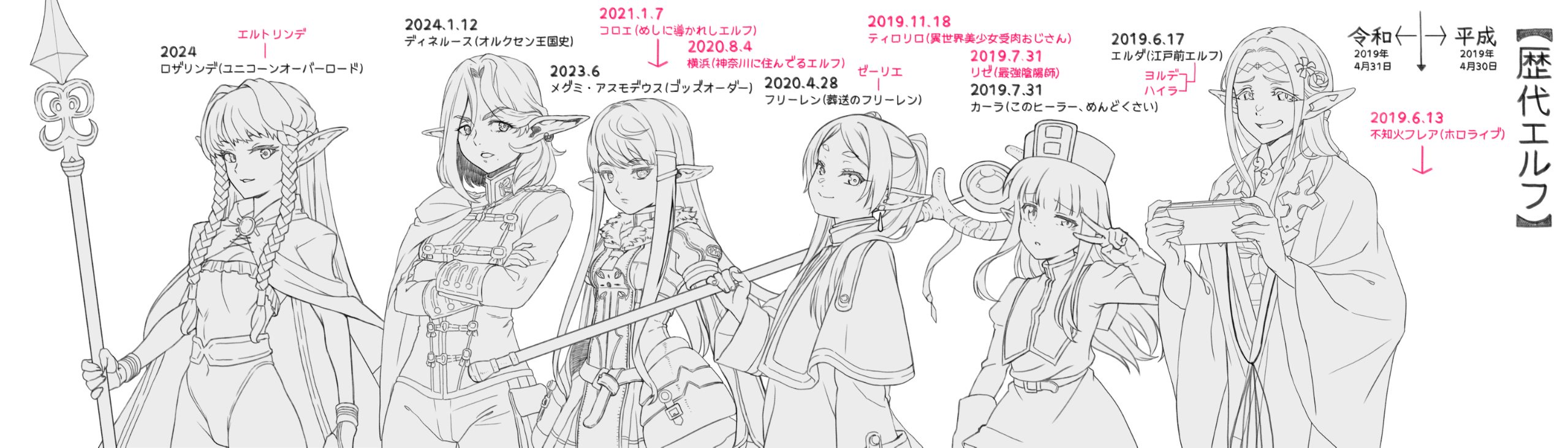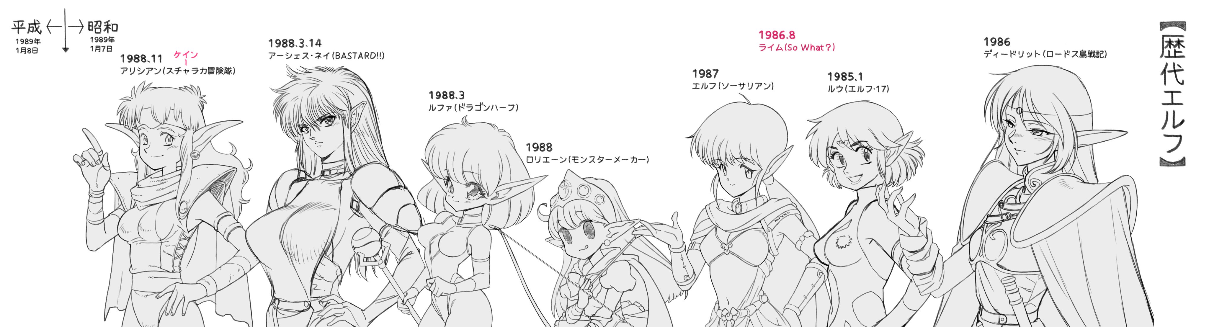 以前描いた『昭和から令和までのエルフ(ごく一部)』です。 pic.twitter.com/1b4j6CQ4m8