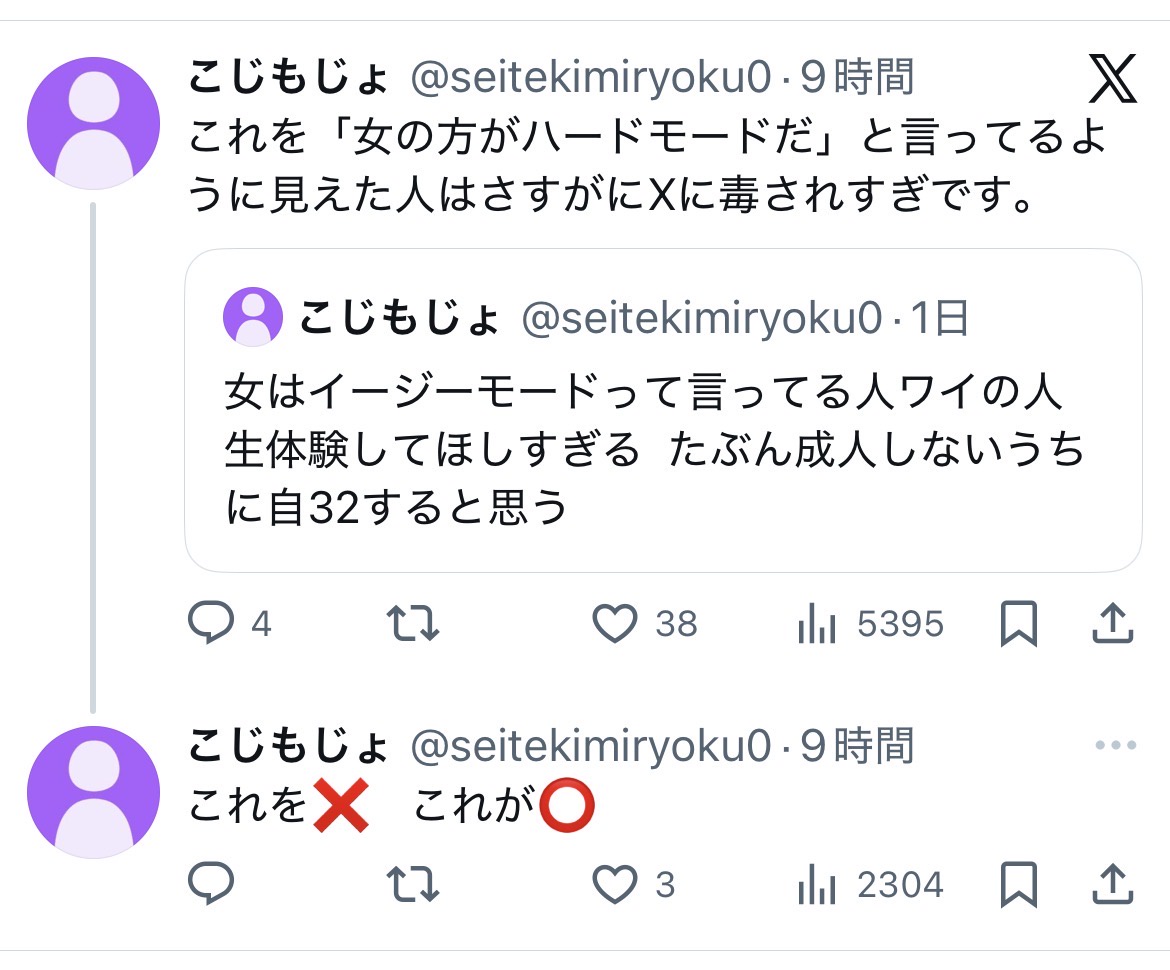 これを「女の方がハードモードだ」と言ってるように見えた人はさすがにXに毒されすぎです。 https://t.co/cKEEVRyAOe