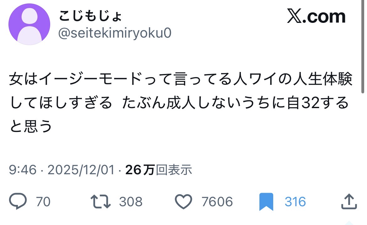 女はイージーモードって言ってる人ワイの人生体験してほしすぎる たぶん成人しないうちに自32すると思う