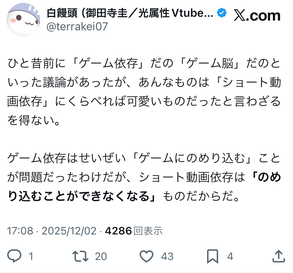 依存っていうか暇つぶしの手段がショート動画に取って代わられただけだろ