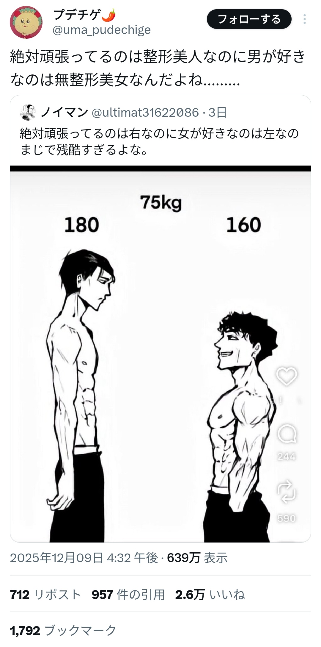 背低いなら低いなりにモテるためにできることはあるが、少なくともそれはマッチョになることではない。右の努力はモテるためのものではないのだから残酷でもなんでもない。