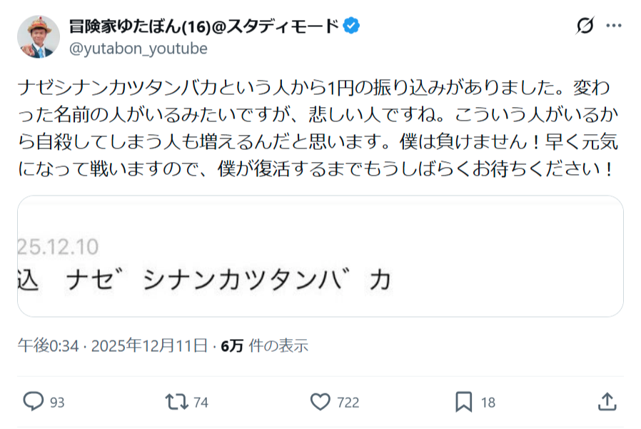 ゆたぼんは11日、「ナゼシナンカツタンバカという人から1円の振り込みがありました」と打ち明け、振り込んだ人物の名前を公開。「変わった名前の人がいるみたいですが、悲しい人ですね。こういう人がいるから自殺してしまう人も増えるんだと思います。僕は負けません!」と宣言。「早く元気になって戦いますので、僕が復活するまでもうしばらくお待ちください!」と投げかけた。