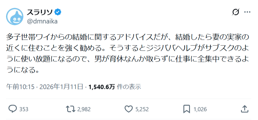 多子世帯ワイからの結婚に関するアドバイスだが、結婚したら妻の実家の近くに住むことを強く勧める。そうするとジジババヘルプがサブスクのように使い放題になるので、男が育休なんか取らずに仕事に全集中できるようになる。