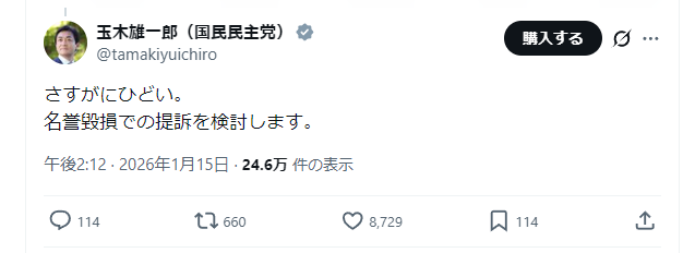 — 玉木雄一郎(国民民主党) (@tamakiyuichiro) January 15, 2026