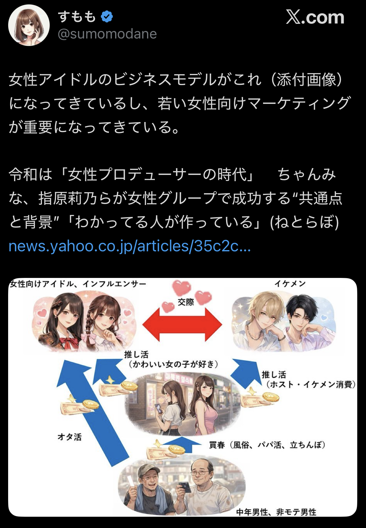 女性アイドルのビジネスモデルがこれ(添付画像)になってきているし、若い女性向けマーケティングが重要になってきている。