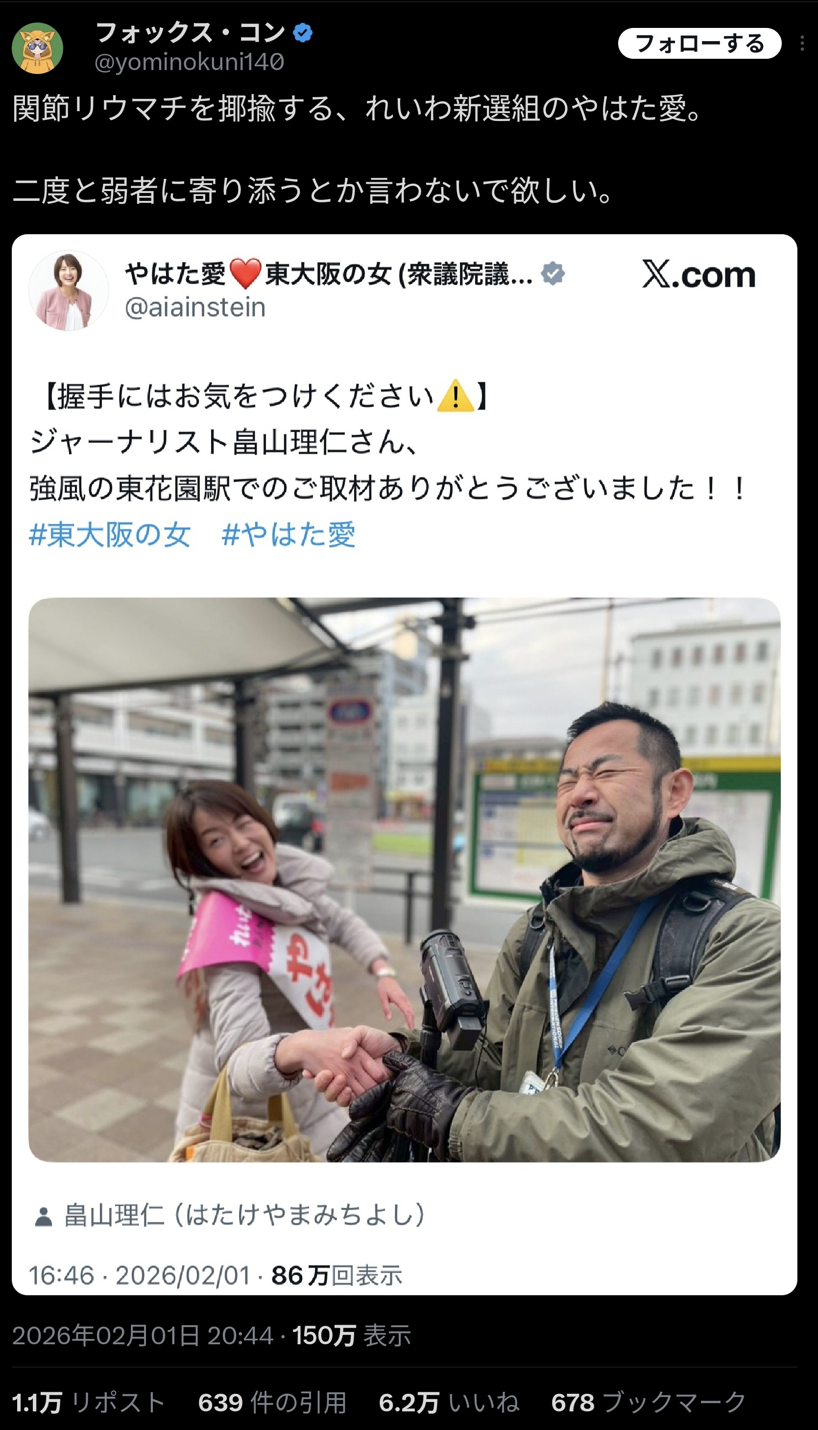 特にむかつくのは日本をよくしようと本気で政権狙ってないのがムカつく、こんな投稿したら普通の人が不愉快になるのわかるはず、高市さん嫌いな人でも怪我を揶揄するような投稿みたら引くよ。では何故こんな投稿するのか?それは一部の狭い支持層にアピールする為のサービス行為。私は高市をバカにしてやりました皆さん見てください、私はこんなに高市を卑下しました、私はなかなかやるでしょ?ふふん♪って仲間へのじいこういでしかない。そんな狭いそうを満足させる為に大半の有権者を切り落としてる、そんな奴らがリベラル気取って世界がーとか言ってるのが意味わからない。