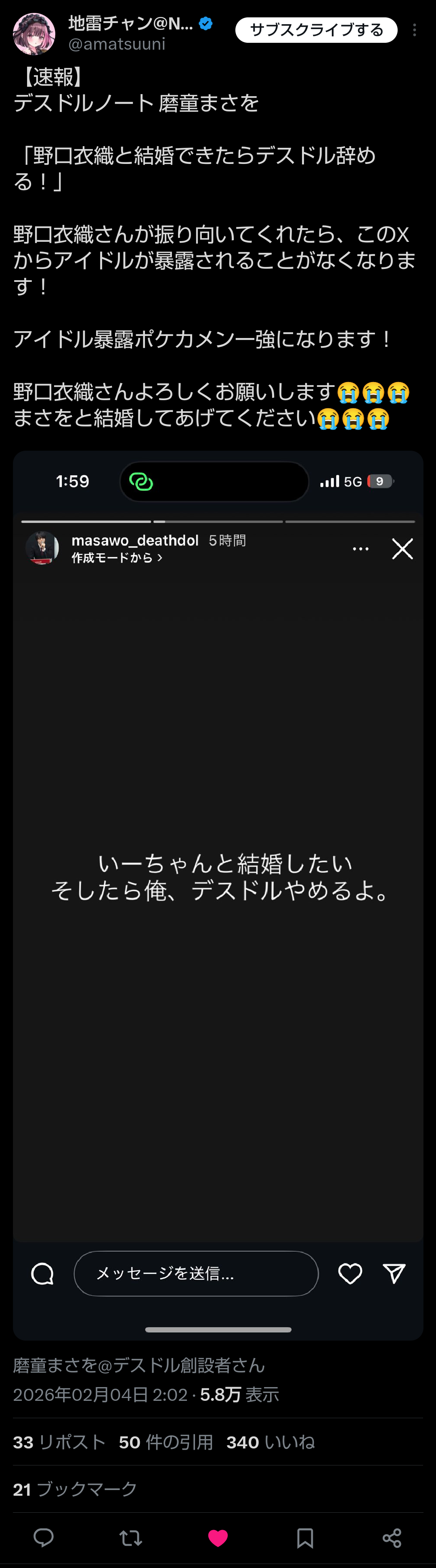 「大切な人が出来たからこそ、自分のやるべきことがはっきりしました。」とか言って活動続けるんだよ。んで、総ツッコミされて話題に登ることも見越してんだよ。