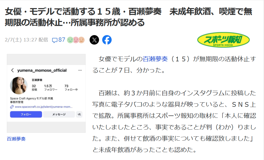 百瀬は、約3か月前に自身のインスタグラムに投稿した写真に電子タバコのような器具が映っていると、SNS上で拡散。所属事務所はスポーツ報知の取材に「本人に確認いたしましたところ、事実であることが判(わか)りました。また、併せて飲酒の事実についても確認致しました」と未成年飲酒があったことも認めた。