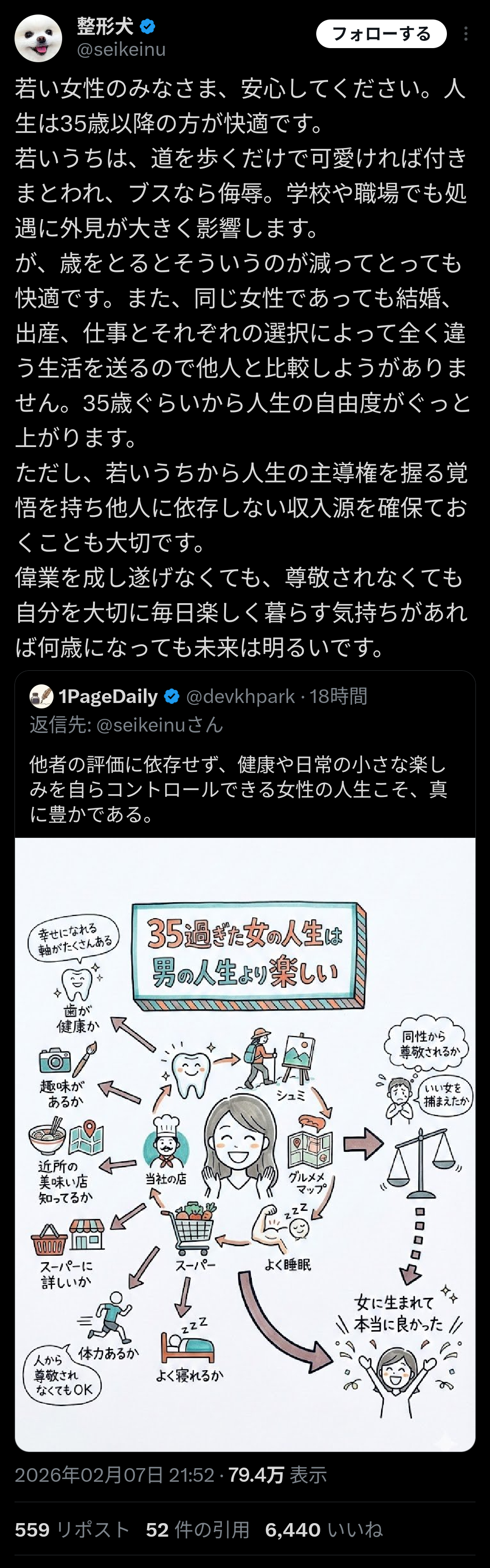 他者の評価に依存せず、健康や日常の小さな楽しみを自らコントロールできる女性の人生こそ、真に豊かである。 pic.twitter.com/AUxnTZP5C1