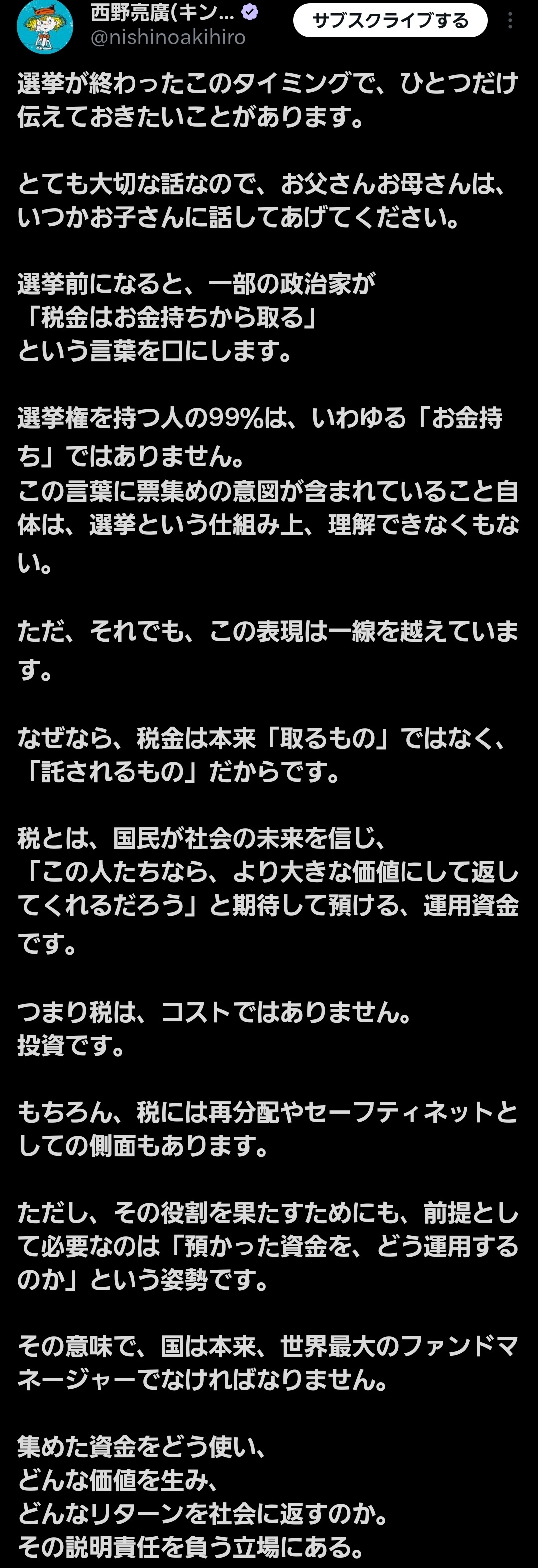 西野は鼻につくが税金が国を豊かにするための投資だという視点は至極真っ当だわ