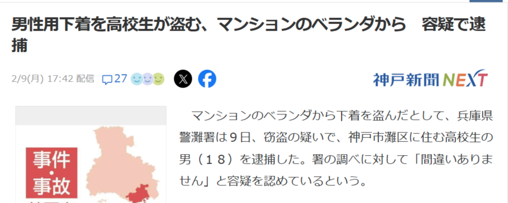 逮捕容疑は1月20日午後7時15分ごろ、神戸市灘区のマンションで、1階にある一室のベランダから男性用の下着2点を盗んだ疑い。