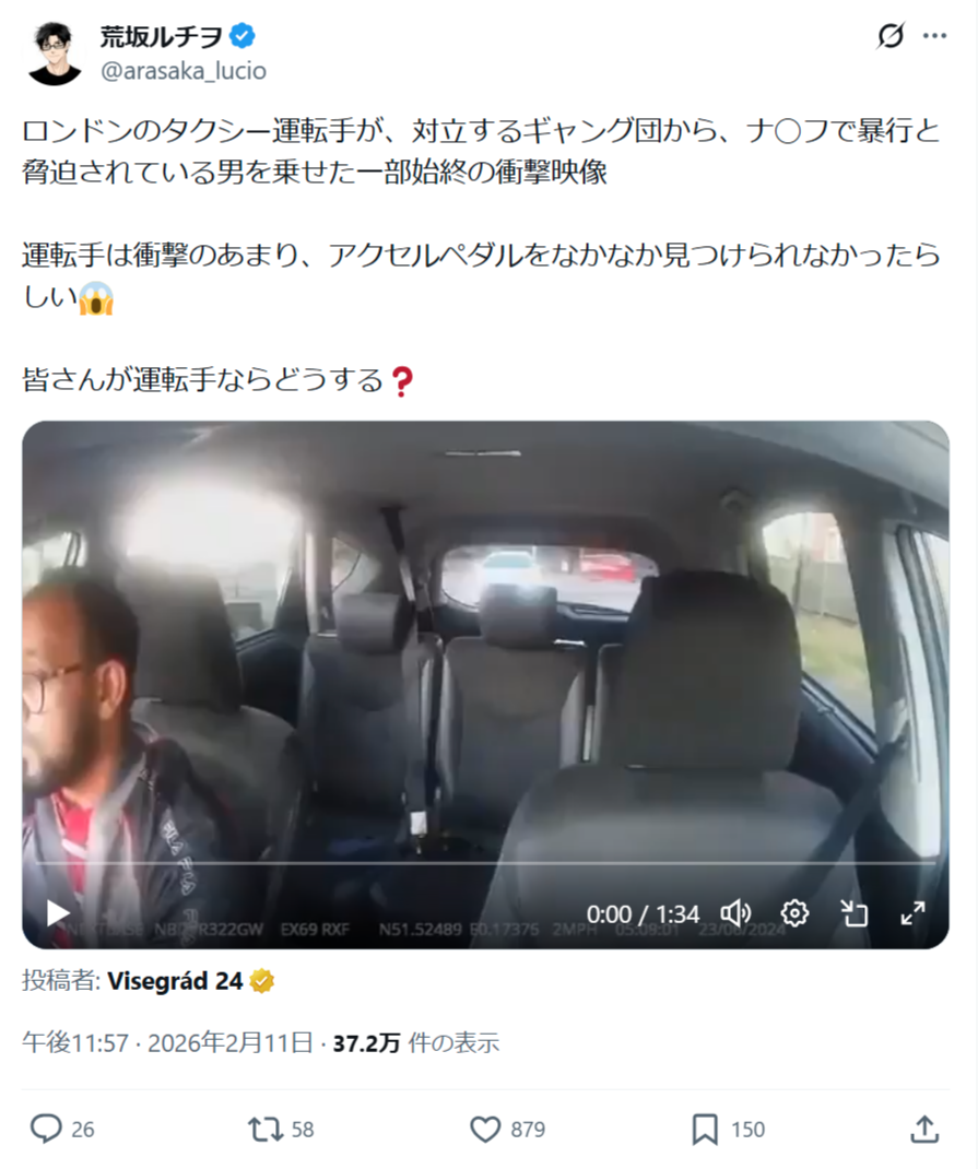ロンドンのタクシー運転手が、対立するギャング団から、ナ◯フで暴行と脅迫されている男を乗せた一部始終の衝撃映像