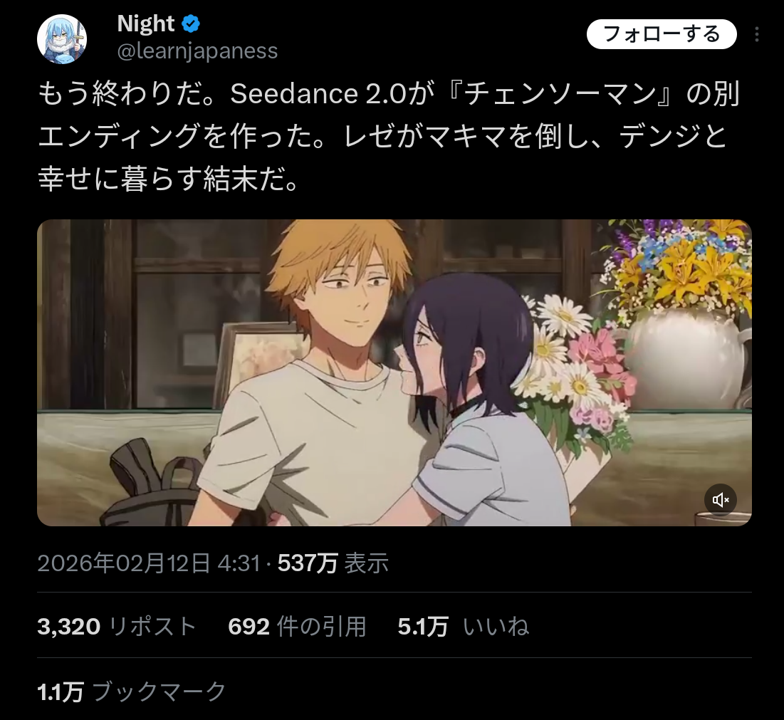 もう終わりだ。Seedance 2.0が『チェンソーマン』の別エンディングを作った。レゼがマキマを倒し、デンジと幸せに暮らす結末だ。 pic.twitter.com/vBiaefOGx4