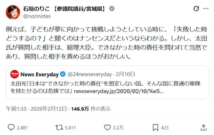 — 石垣のりこ 【参議院議員/宮城県】 (@norinotes) February 11, 2026