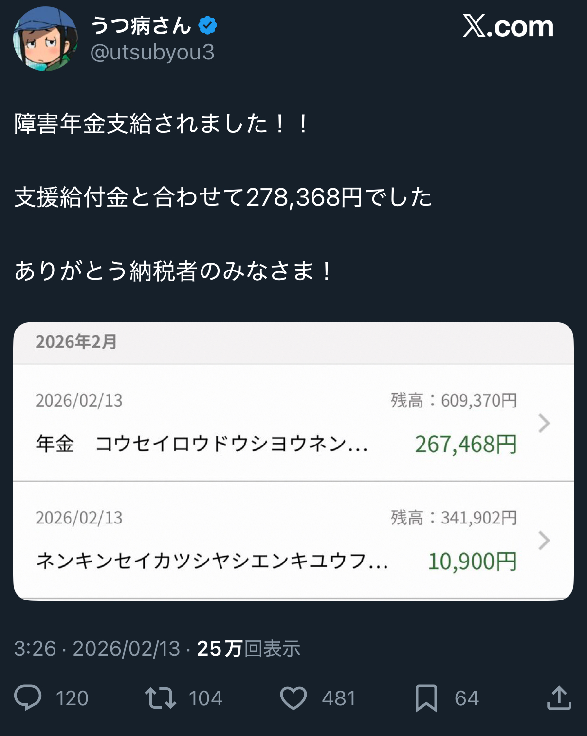 障害者年金がないと生きていけない人がわざわざ障害者年金に対する国民感情悪化させるのほんま理解できない思考してるわ