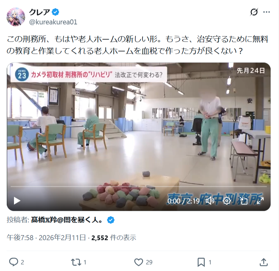 この刑務所、もはや老人ホームの新しい形。もうさ、治安守るために無料の教育と作業してくれる老人ホームを血税で作った方が良くない?