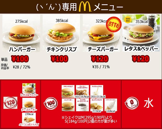 ハンバーガー80円、チーズバーガー100円のイメージだわ