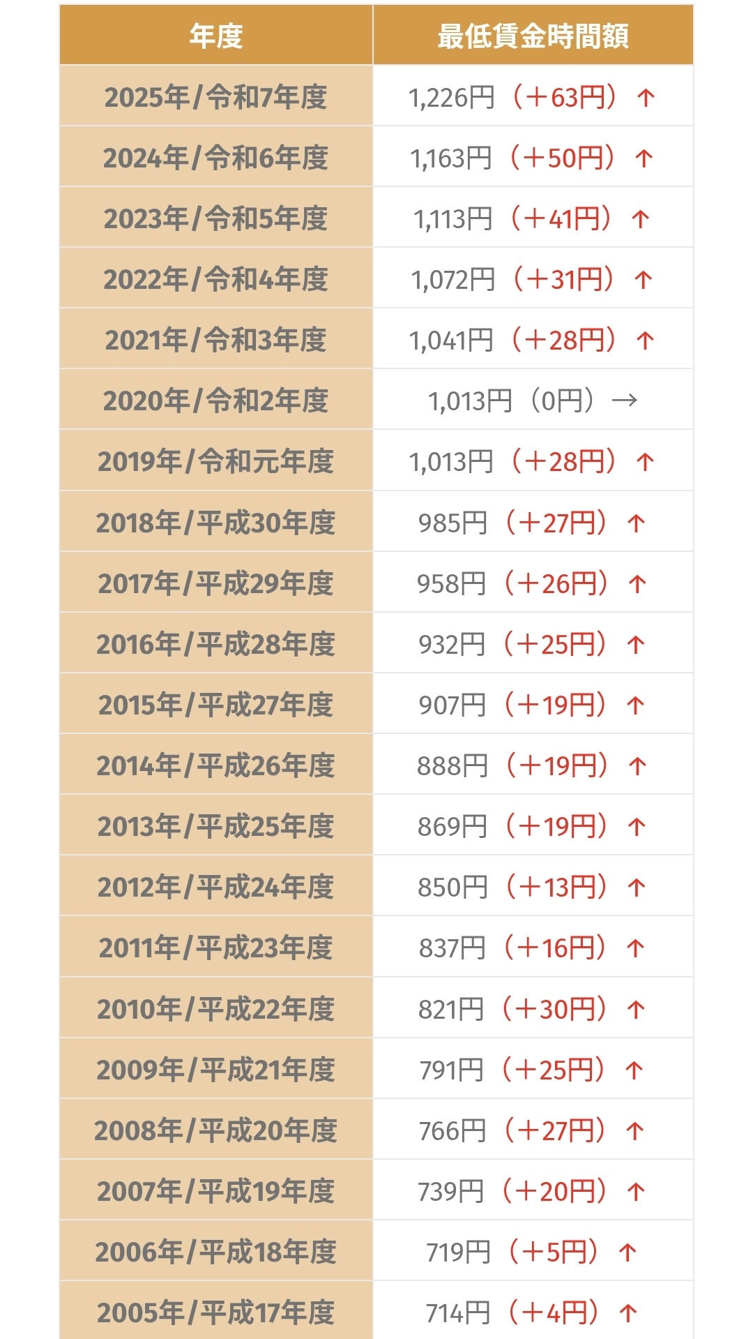 (平成17年)の全国加重平均最低賃金は668円でした。東京は最高額の714円、最低の県では608円でした