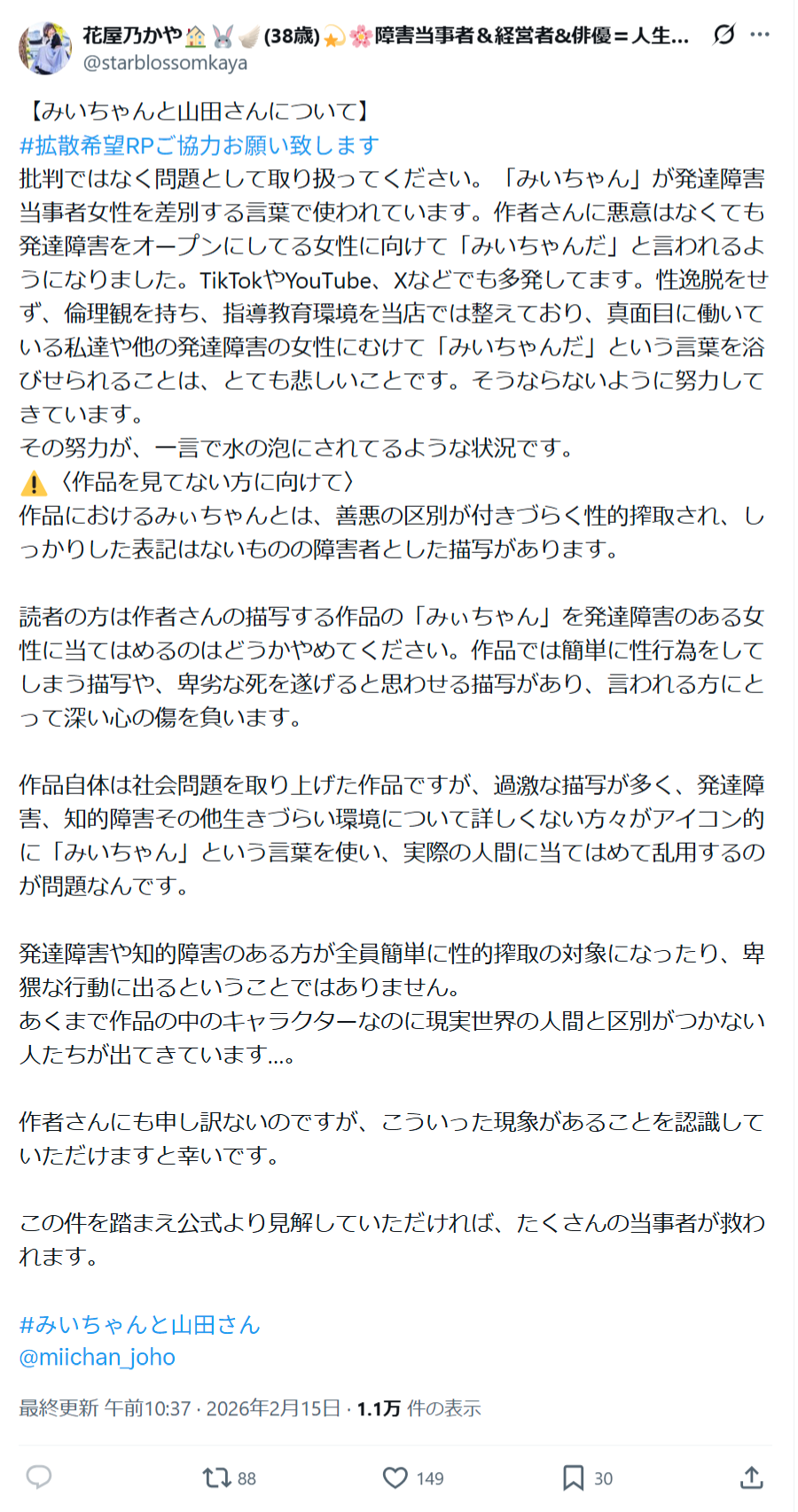 — 花屋乃かや🏠🐰🪽(38歳)💫🌸障害当事者&経営者&俳優=人生の表現者 (@starblossomkaya) February 15, 2026