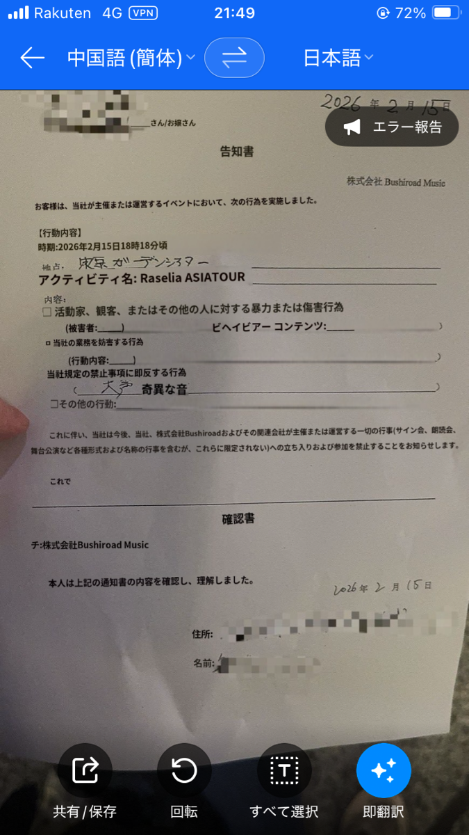 間違いではないかと聞くも出禁処分。免許証を提示させたうえで誓約書書かせる