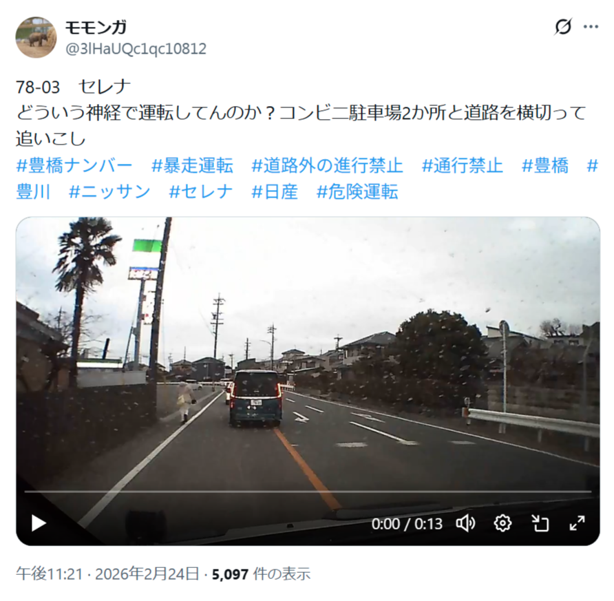 どういう神経で運転してんのか?コンビニ駐車場2か所と道路を横切って追いこし#豊橋ナンバー #暴走運転 #道路外の進行禁止 #通行禁止 #豊橋 #豊川 #ニッサン #セレナ #日産 #危険運転 pic.twitter.com/WoQodvCCfp