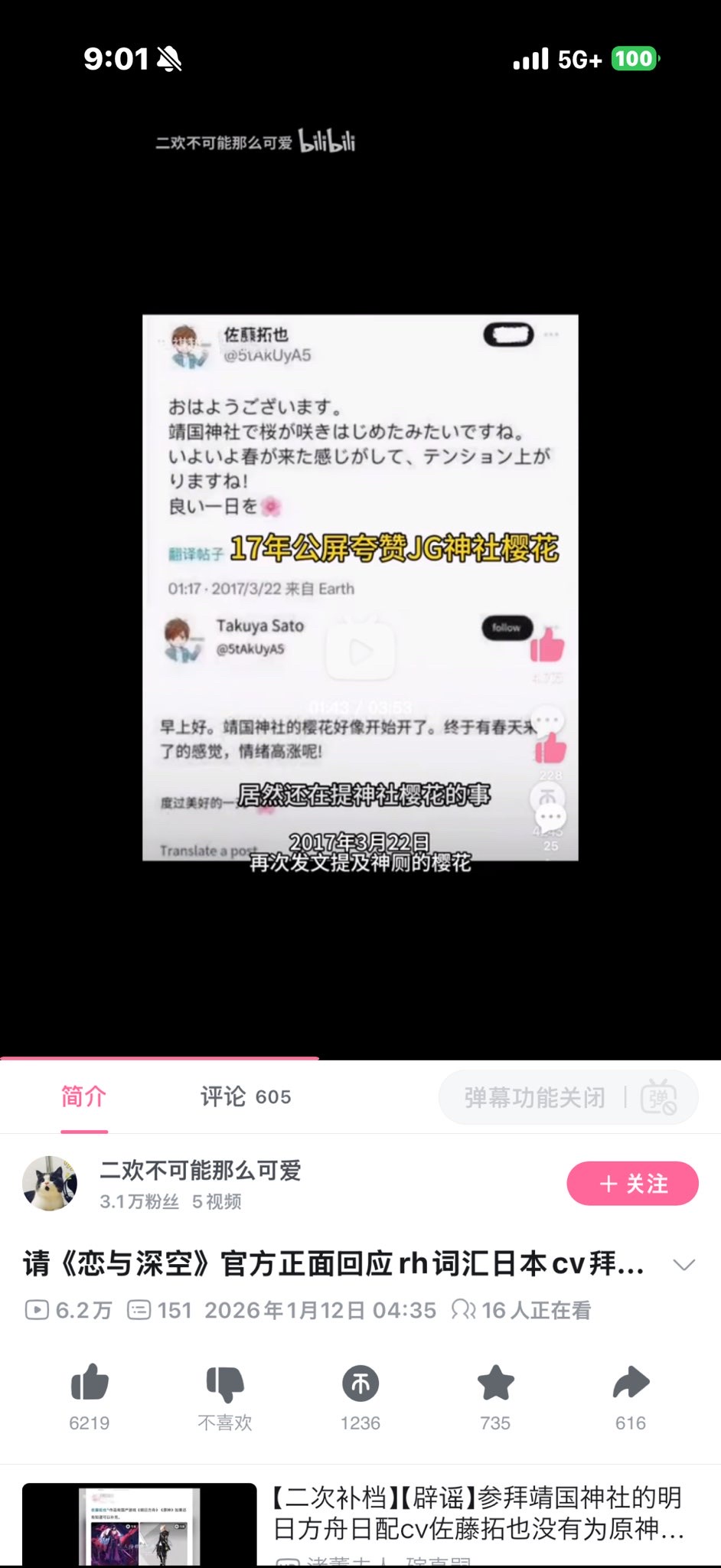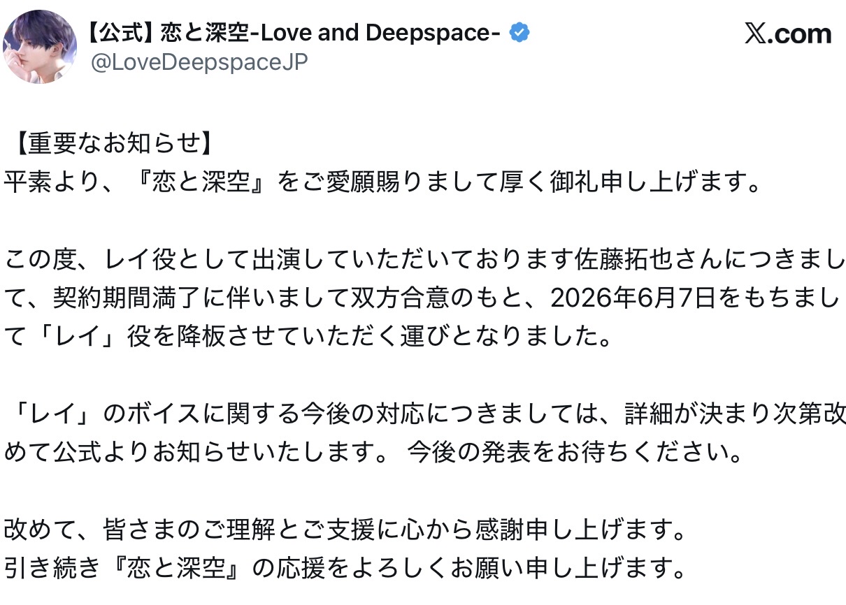 引用コメントに中国語?のコメントがあって、本国の深空ファンが過去に佐藤拓也さんが靖国参拝してたことがわかって中国への侮辱だ!って炎上したから降板になったの日本人は知らないの?公式は本当のこと言えないの的なの見つけたんだけど本当?もし本当なら降板は政治的な事情ってことになるけど… https://t.co/gWY0gRBaZ5